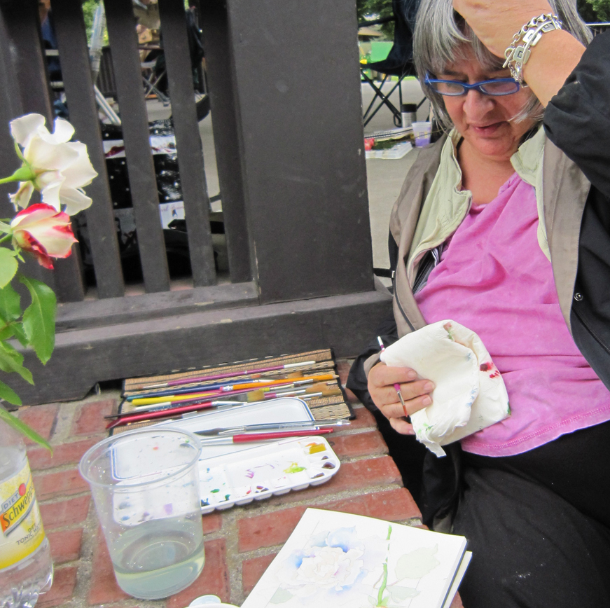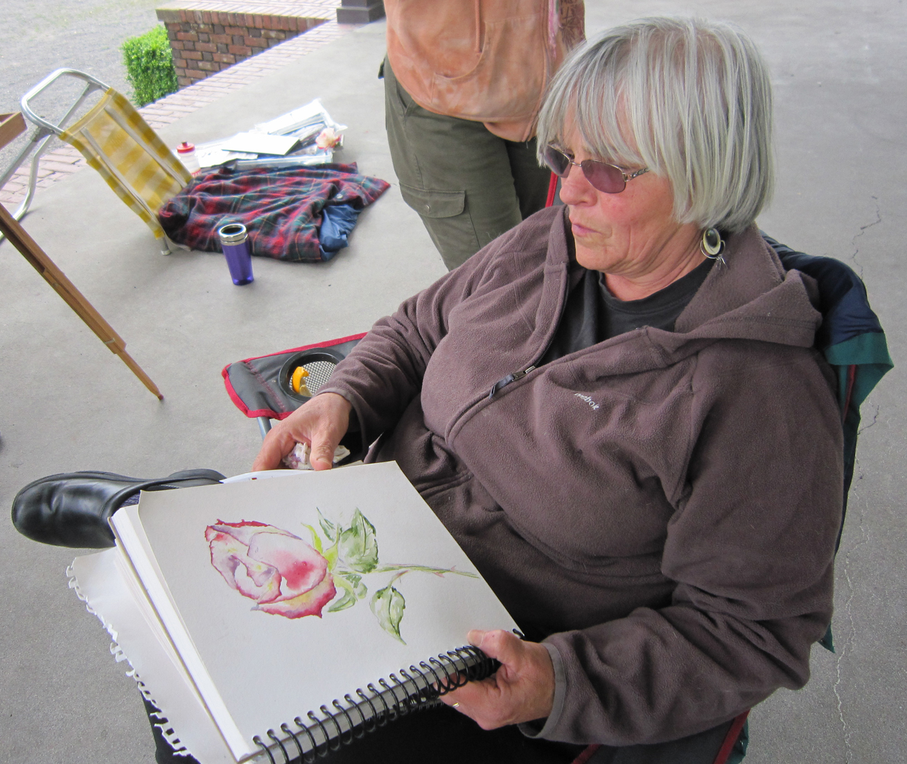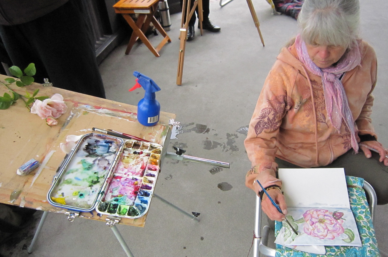 The covered area overlooking the garden was a lovely place to gather on a slightly damp day. I brought several roses from home. The cherry parfait roses with their frilly red edges on creamy white petals and are fun to paint. Notice how everyone’s unique style shows through in their work.