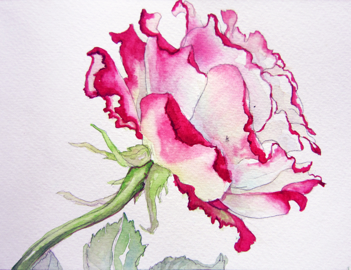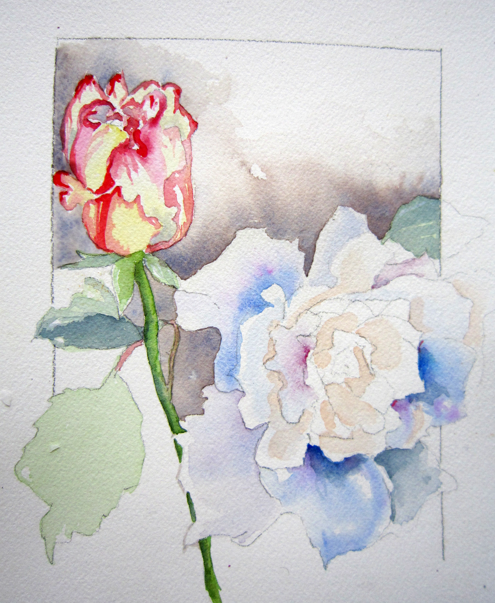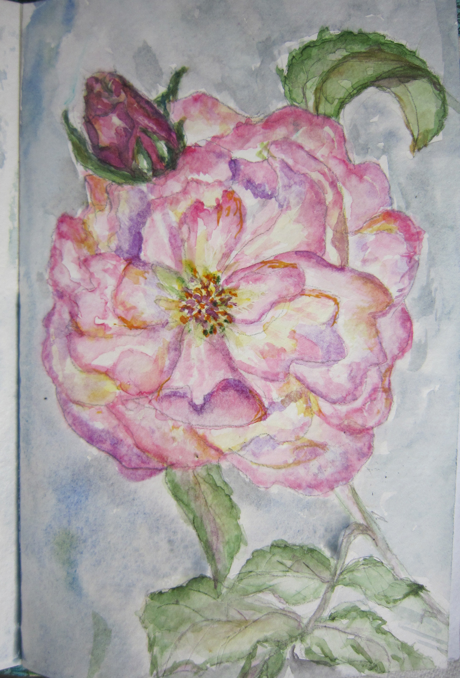 The covered area overlooking the garden was a lovely place to gather on a slightly damp day. I brought several roses from home. The cherry parfait roses with their frilly red edges on creamy white petals and are fun to paint. Notice how everyone’s unique style shows through in their work.