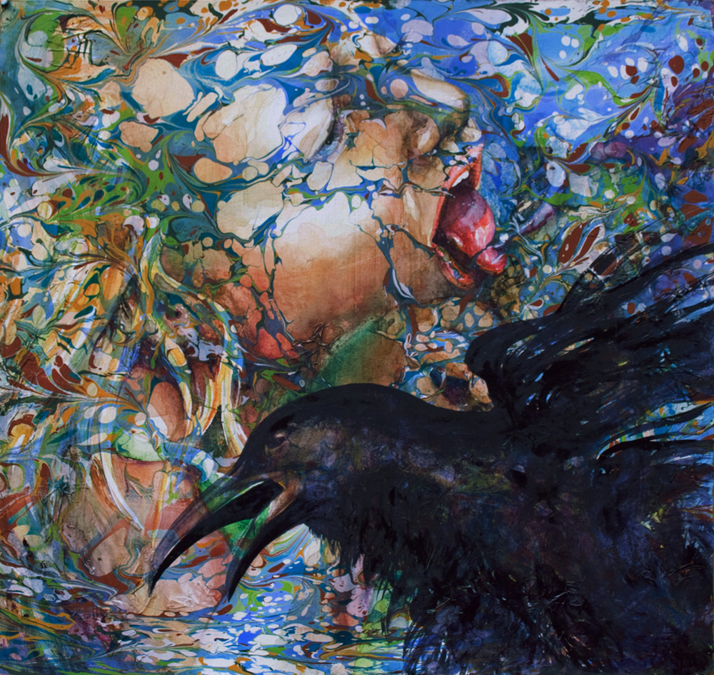 The hands were adequately obscured, but I felt the marbling pattern was a bit too busy — no central image or place for the eye to rest. So I added the bird, painting transparent enough that the marbling still shows through a bit.  I’m thrilled to say that this painting will hang in the Spring WSO show in Albany!