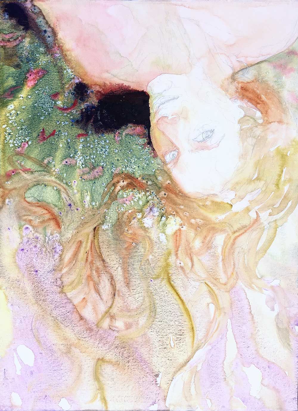 I’ve added more detail to the hair, working in the appropriate values. And I still plan to integrate the edge between body and background. But my aim is to complete this without destroying all the freshness created by the paint pours!